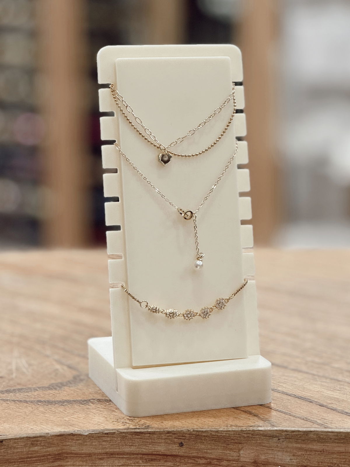 - Diseño Optimizado: Su formato vertical permite mostrar varios collares a la vez, destacando sus diferentes estilos y longitudes, lo que es ideal para sets o combinaciones.