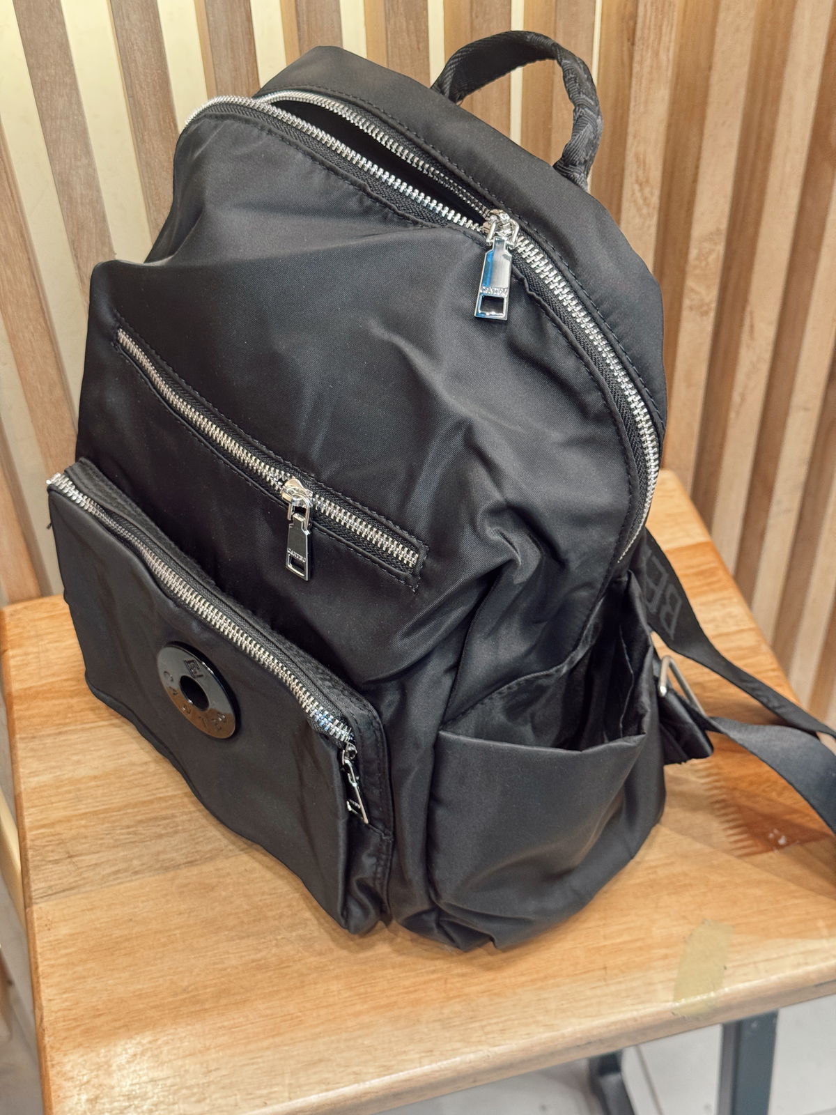 Bolsillo frontal amplio con cierre y detalle circular decorativo.